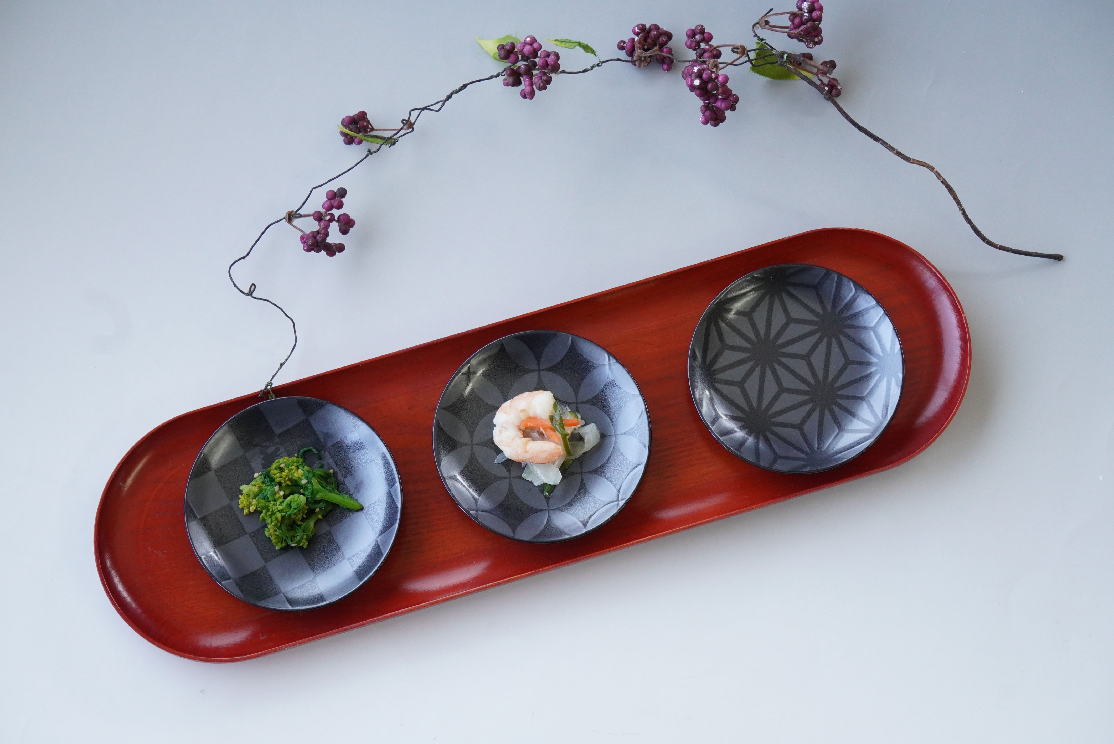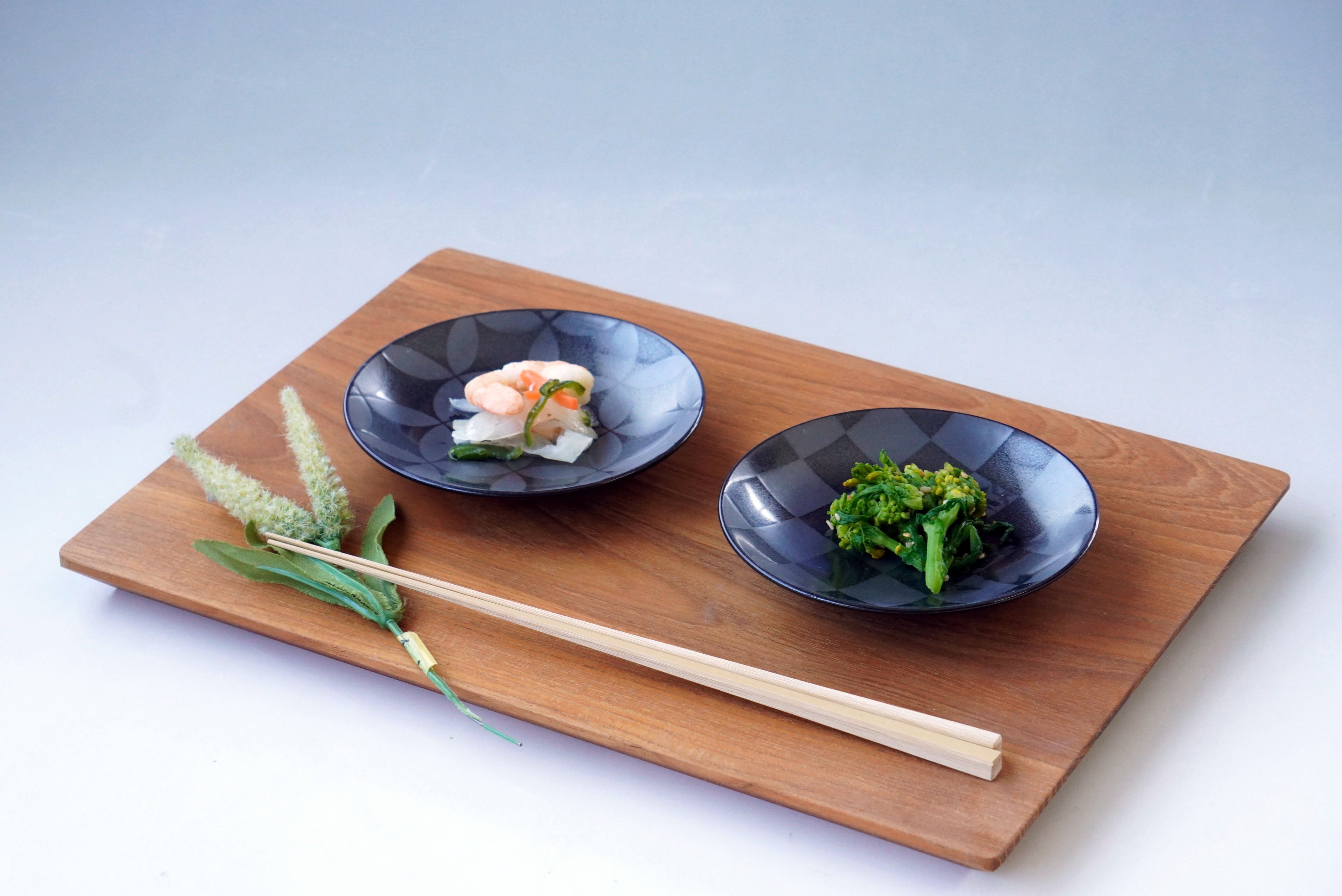 麻の葉・七宝・青海波・市松など、古くから縁起の良いとされる6種類の文様を、落ち着いた黒地にさりげない艶でデザイン。和の趣がありながら、現代の食卓にも自然に馴染みます。